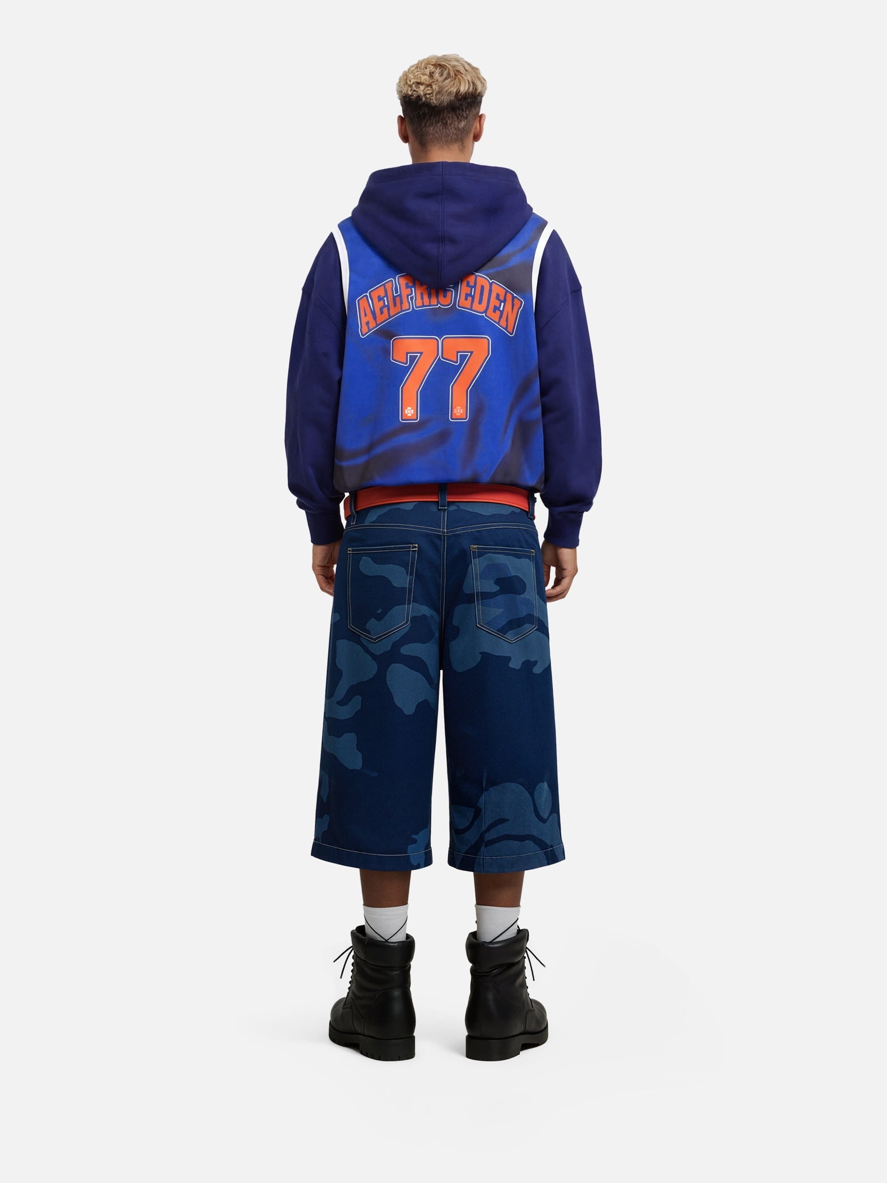Designed with a layered jersey-on-hoodie look, this piece blends athletic graphics with everyday streetwear ease. The bold “77” print and arched Aelfric Eden lettering anchor the front, while contrast piping and panel details add depth to the silhouette. Soft fabric keeps it comfortable for daily wear, making it an easy statement piece whether styled solo or layered into a full look.