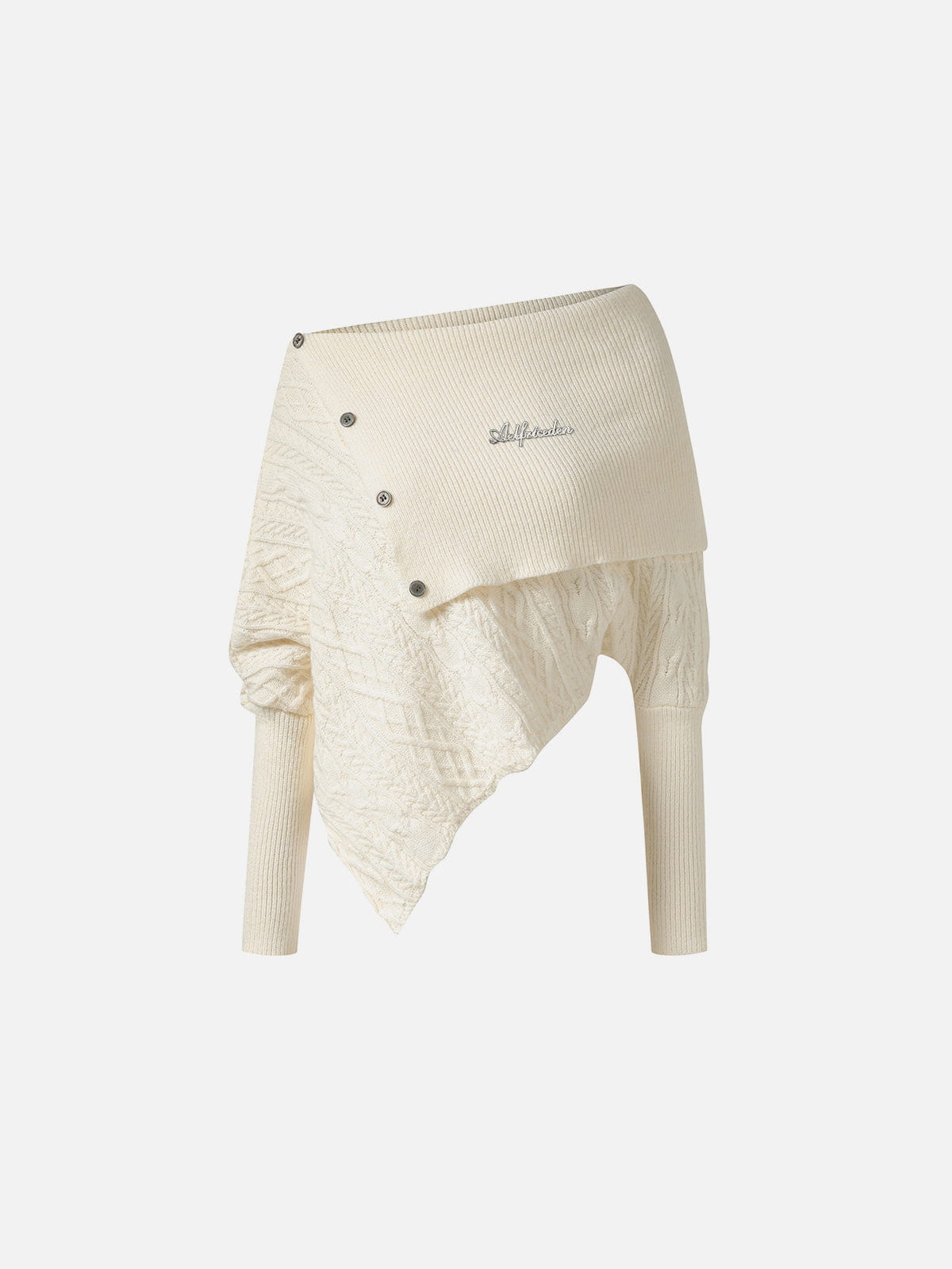 Designed with an asymmetric shoulder panel and angled drape, the sweater creates a fluid silhouette that feels relaxed yet deliberate. Button accents introduce subtle structure, allowing the shape to shift with different styling choices. Without relying on bold graphics, it delivers a quiet sense of individuality suited for everyday layering.