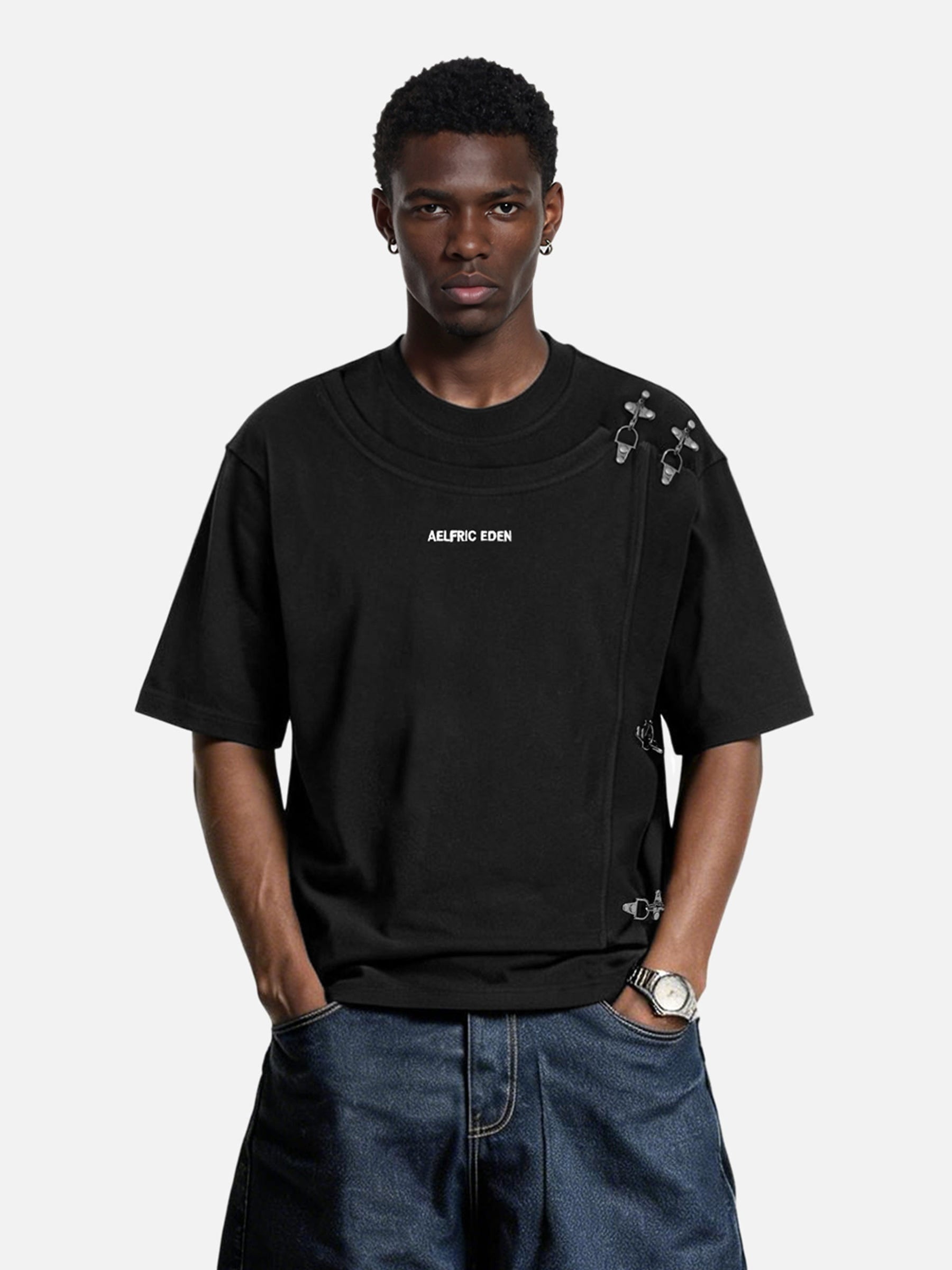 This tee features a layered front construction secured with metal button hardware along one side. The design includes a round neckline with visible layered edges, short sleeves, and a straight hem. A small Aelfric Eden logo is printed at the chest, with stitching lines defining the layered structure.